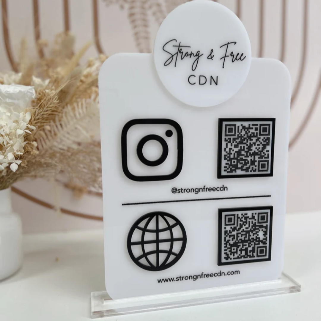 Social media signs are a great way to promote your business, accept payment or book client appointments! They're both stylish + modern and can be personalized with your business details and any two mirror acrylic icons and two QR codes to create a beautiful 3D effect. Each piece is laser engraved